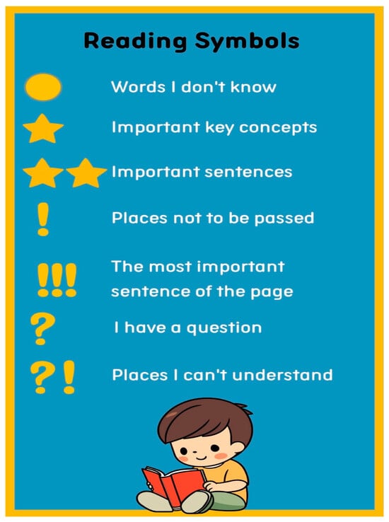 Following awareness training, weekly group meetings were held to read the selected texts while considering the close reading strategy. Each week, a different student was assigned as the reading leader to manage the reading process according to the prepared plan. The reading leader was responsible for managing the time for each phase and uploading student annotations onto the virtual classroom. Tools like “Reading Symbols”, the “4 Pen Method”, and colored sticky notes were used during this process. An example of the “Reading Symbols” card prepared with the students is shown in Figure 3.