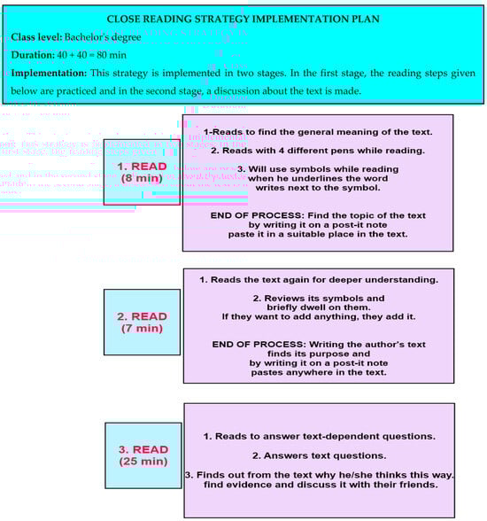 The close reading strategy, one of the strategies used for deep understanding of a text, is a phased and multiple-part strategy that involves the intertwinement of many strategies that reveal and structure meaning in different layers of the text [,]. This strategy, which involves an analytical process that encourages deep thinking about the text [,], allows for the comprehensive examination of meaning in the text through multiple readings of a short, complex text, adding annotations to a text, discussing a text with questions based on a text, and thus examining the meaning in a text extensively through prior knowledge and personal experiences [,,]. This repeated reading action with various strategies extracts the cognitive skeleton of a text, and group discussions reveal the meaning in a text [,]. These text-based questions and discussions allow for the resolution of connections between key words, the form of a text, the author’s style, rhetorical tools, imagery, word choice, and syntax in a text for close analysis [,], thereby facilitating a deeper understanding of a text []. This is because the close reading strategy develops strategic reading skills that contribute to critically examining a text [,,].