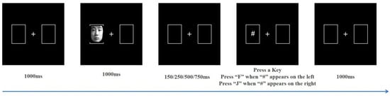 This study selected 30 images each of positive (happy), neutral, and negative (sad to angry in a 1:1 ratio) emotional facial expressions from the Chinese Affective Face Picture System (CAFPS) to serve as cue stimuli [], with an equal distribution of male and female faces. As shown in Figure 1, the screen features a pair of boxes positioned on its left and right sides. The white fixation point in the middle of the two boxes automatically disappears after 1000 ms, and one of the boxes will then contain the cue stimulus (i.e., emotional face). The cue stimulus will automatically disappear after 1000 ms. The target stimulus “#” appears after stimulus onset asynchrony (SOA) of 150 ms, 250 ms, 500 ms, or 750 ms. Participants must judge the “#” position as soon as possible and respond accordingly, press the “F” key in response to the “#” symbol appearing on the left side of the screen, and the “J” key when the “#” symbol is on the right side. A blank screen then appears for 1000 ms, after which the next trial begins. Participants completed a total of 360 trials, organized as 60 trials for each of the six conditions, namely, positive emotion—effective cues, positive emotion—ineffective cues, neutral emotion—effective cues, neutral emotion—ineffective cues, negative emotion—effective cues, and negative emotion—ineffective cues (hereinafter referred to as positive—effective, positive—ineffective, neutral—effective, neutral—ineffective, negative—effective, and negative—ineffective). The cue and target stimuli were randomly displayed on the left and right sides of the screen in a 1:1 ratio.