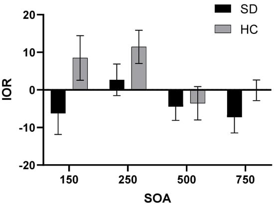 A repeated-measures ANOVA was conducted to assess the IOR, considering SOA and cue emotion as the variables that vary within subjects (Figure 2). The results indicated a significant main effect for the group factor (F(1,44) = 4.805, p = 0.034, η2 = 0.098), with the SD group demonstrating a longer IOR than the HC group. Additionally, the main effect of SOA was also significant (F(1,44) = 2.877, p = 0.049, η2 = 0.061). The IOR of SOA at 250 ms was significantly shorter than that of SOA at 500 ms or 750 ms (pSOA=500ms = 0.023, pSOA=750ms = 0.034, respectively). The IOR when SOA was 750 ms was shorter than that when SOA was 500 ms, indicating that the return inhibition effect was more obvious when SOA was 750 ms.