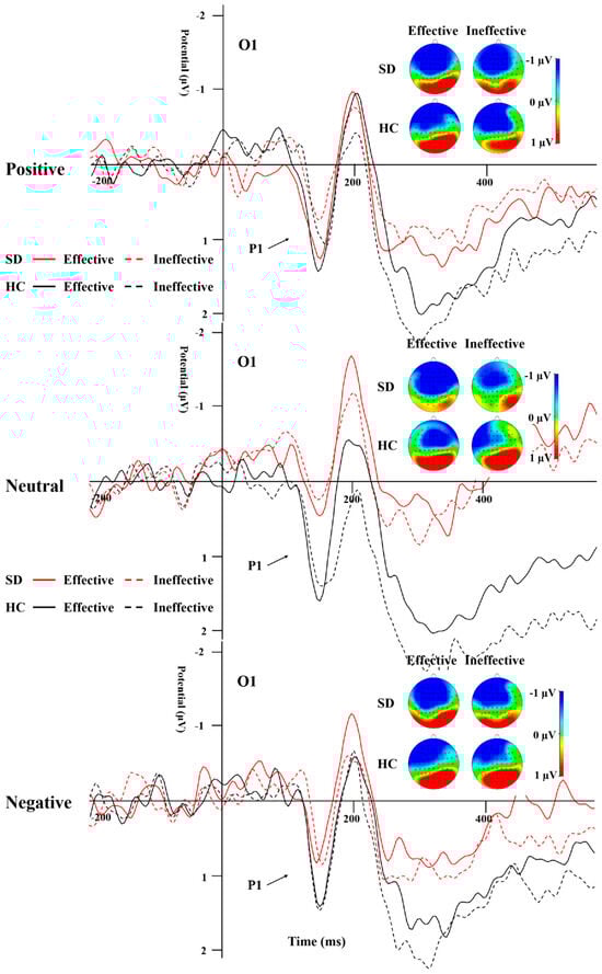 P1 and N170 are two early ERPs that have been extensively studied during early emotional face processing. The P1 of the occipital region is an important indicator of perceptual processing and is associated with activity in the striatal cortex []. The amplitude of this component is influenced by emotional factors [] and escalates in response to the prominence of negative stimuli []. P1 is often used as an indicator of directed acceleration of attention [,]. In this study, overall, the P1 peak in the SD group was significantly less pronounced in positivity compared to the HC group, especially under the neutral emotion condition, suggesting that the overall response ability in SD individuals is weak. In the SD group, the P1 peak induced by positive and negative emotional stimuli was more positive than that induced by neutral stimuli, while the latency of P1 induced by positive and neutral emotional stimuli was shorter than that induced by negative emotional stimuli. In the HC group, the P1 peak and latency caused by the three emotional stimuli under the effective cue condition did not differ from those in the SD group. However, for ineffective cues, the peak P1 caused by positive and negative emotional stimuli was less positive than that caused by neutral stimuli, and the latency was shorter than that of neutral stimuli, indicating that SD individuals have early directional acceleration of attention to emotional stimuli compared to neutral stimuli, but no significant negative bias.