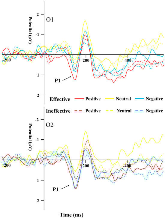 P1 elicited by the emotions and effective/ineffective conditions recorded at the O1 electrode.