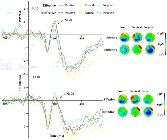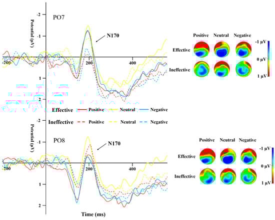 The EEG data were processed offline using Analyzer 2.2, a software designed for the analysis of electrophysiological data, and the resulting figures were prepared using the same software suite. The offline processing of EEG data was based on the following series of steps: the reference electrode was replaced with the bilateral mastoids (TP9, TP10); a low-cut filter at 0.3 Hz, a high-cut filter at 30 Hz, and a 50 Hz notch filter were applied to all channels; independent component analysis (ICA) was utilized to eliminate EOG artifacts; and “Fp2” was designated for vertical EOG correction to mitigate the influence of blinking or eye movements. After the removal of artifacts due to equipment or participant actions, data were segmented from −200 to 1000 ms and baseline corrected from −200 to 0 ms. Participants with more than 50% trial rejections were excluded from the analysis []. The data were then subjected to superposition and averaging across six conditions: “positive—effective”, “positive—ineffective”, “neutral—effective”, “neutral—ineffective”, “negative—effective”, and “negative—ineffective”. The average amplitude of each ERP was superimposed with at least 30 trials.