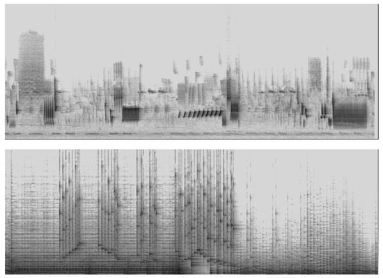 To make these claims somewhat more concrete, we depict in Figure 2 a spectrographic depiction of birdsong (nightingale) and a piece of music (Bartók. Sonata for 2 pianos and percussion, 3rd movement) to represent the change in spectral energy over time as the sounds unfold. As to the nightingale, what immediately stands out is the extreme richness of the spectral pattern of the song. Some listening skill is required to interpret and/or recognize the acoustic signal in such a way as to recognize the differences between the visualized acoustic patterns, and it would be challenging to listen to the song as music. Hearing and recognizing all the minutiae of the changes in its acoustic parameters, in fact, is of a different order than merely recognizing the whole structure merely as being the song of a nightingale. It is the distinction between a kind of “continuous” tracking of the sonorous unfolding and reducing this temporal course to just one “discrete” assignment of meaning to the birdsong as a whole (it is a nightingale). The spectrogram of Bartok’s piece, on the other hand, looks totally different with musical instruments being used in a rather percussive way—the depicted fragment shows the sound of two pianos, timpani, and a xylophone—but even if this music sounds very dynamic and percussive, with a richer spectrum, due to the percussive sounds, there seems to be less differentiation in the darker patterns that show louder configurations. There seem to be, as it were, significant register distinctions in exploiting the spectral space of the nightingale and Bartók’s music, and the question can be raised as to whether it is possible to differentiate between music and animal sounds on the basis of the inspection of a spectrogram. At first glimpse, there seems to be a difference in the stability of fundamental frequencies (Fo)—or harmonics in general—over time. In the birdsong, only some Fo’s are stable, while in the Bartók fragment, there are many more stable sound units. Moreover, the distribution of time units through time seems to be more regular in the Bartók piece than in the birdsong. This regularity allows us to feel (or experience or extract) the musical pulse, which, thanks to cognitive predictive mechanisms, constitutes a kind of scaffolding for the quantification of sounds in music [179].