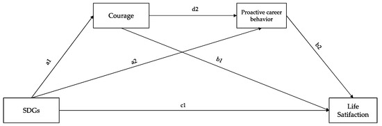While the importance of considering the SDGs in career development is widely acknowledged, quantitative studies exploring this relationship are scarce, especially with regard to the study of their relationship with adaptive responses. Indeed, while the relationship between the SDGs and life satisfaction has been confirmed by previous studies [62], the relationship between the SDGs and specific important adaptive responses—in this case, courage and career proactive behaviors—has never been explored. The present study aims to fill this gap by investigating the relationship between the propensity to believe that the SDGs will affect one’s future career and adaptive responses, i.e., courage and career proactive behaviors, as well as life satisfaction, as an indicator of well-being. Additionally, this study examines the mediating role of these adaptive responses between the propensity to consider that the SDGs influence future career and life satisfaction. Based on the outlined literature and drawing on the theoretical framework of CCT, an increased awareness of the role of the SDGs in future career plans can increase courage in making career choices, promote proactive career behaviors, and, in turn, lead to life satisfaction. Therefore, courage and proactive career behaviors can act as sequential mediators, first courage and then behaviors, in the relationship between the SDGs and life satisfaction.