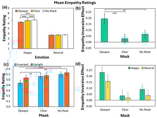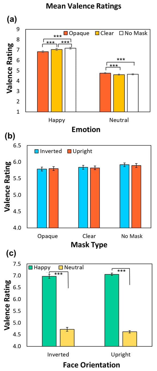 https://osf.io/b24wm/ (accessed on 8 September 2024). Mean ratings of empathy and valence were calculated for each Face Orientation, Emotion, and Mask condition and for each participant. These ratings were entered into two repeated measures ANOVAs with factors of Face Orientation (2; Upright, Inverted), Emotion (2; Neutral, Happy), and Mask (3; No Mask, Clear Mask, Opaque Mask), run separately on mean empathy and valence ratings. All follow-up