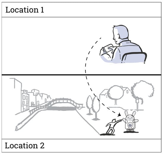 Survey illustration depicting a telerobotic scenario. A person in Location 1 is using their mobile device to operate a telerobot situated in Location 2.