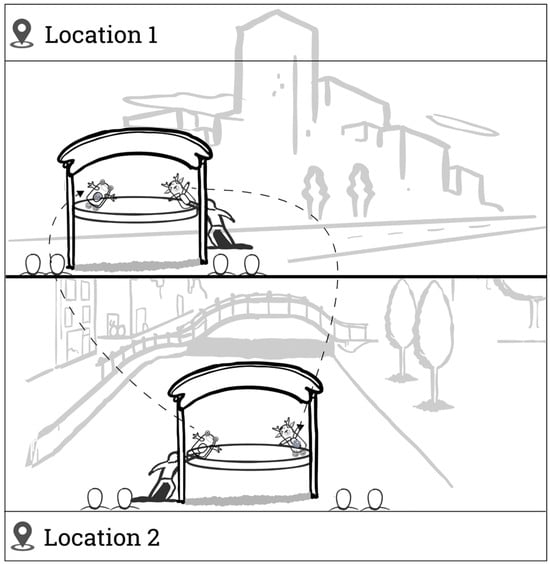 Once the participants completed the sections on telerobot and avatar design preferences, they were presented for the first time with the idea of using a telerobot to communicate with members of the outgroup. We first asked about the general attitude toward the outgroup using the feeling thermometer mentioned above and then about the level of interest on a scale from 1 (Definitely not) to 5 (Definitely yes) in meeting a member of the outgroup via four scenarios: a telerobot operated remotely via a smartphone, a robotic puppet performing remotely in front of an audience at a public location, a face-to-face meeting, and an online video chat. Participants who marked either probably not or definitely not on both of the telerobot-based forms skipped to the end of the survey. Those who expressed at least some interest in meeting an outgroup member using a telerobot were then presented with a similar set of questions regarding the preferred identity of their avatar and the preferred feature set of the telerobot when meeting the outgroup. Those interested in the puppeteering option were also presented with a symmetric scenario that included performing with telerobots in two locations simultaneously with a partner from the outgroup (see Figure 2). We also presented two additional questions. The first was to select the type of performance: political satire, children’s theater, adult drama, situational comedy, or other; the second was an open question asking participants to describe the desired type of performance in more detail. Finally, participants were presented with two open questions about their hopes and concerns when meeting a member of the outgroup through a robot.
