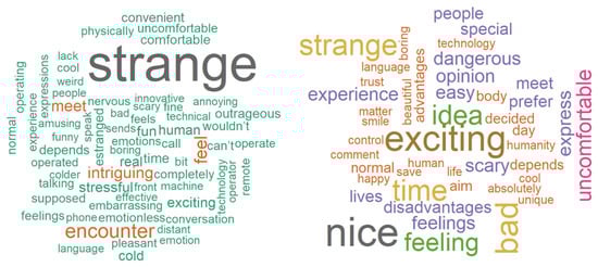 We asked participants how meeting a person via a telerobot would compare to meeting that person face-to-face. The most common word among Israeli Jew participants was ‘strange’ (n = 96/299: in 32% of the responses). For Palestinian participants, there was a more balanced response of positive and negative words. Figure 4 shows a comparison of word clouds. Of the 76 occurrences of ‘strange’ in Israeli Jewish participants, 19 had the form of ‘strange but ‘...’, adding something positive to the opinion. Of those, nine responses were in the form of Strange at first but we could get used to it, all were from Israeli women. Of the 14 occurrences of ‘strange’ in Palestinian participants, two had abated the claim with an additional positive comment. Overall, in response to RQ1, attitudes toward robots and telerobots differed greatly between Palestinians and Israeli Jews, with Israeli Jews having a more negative attitude toward robots and a more wary approach to telerobotics.