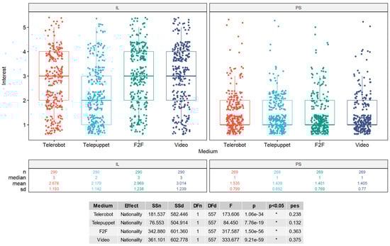 A more positive attitude toward robots on the NARS scale did not predict the willingness of Palestinians to meet the outgroup via telerobotic scenarios, but did increase the willingness of Israeli Jews in both the telerobotic avatar scenario (r = −0.25, p < 0.001) and the telerobotic puppet theater scenario (r = −0.15, p = 0.01). Therefore, H1 is accepted for Israeli Jews and rejected for Palestinians. Furthermore, the willingness to operate a robot in a casual scenario also predicted the willingness of Israeli Jew participants to operate a telerobot in Palestine (r = 0.21, p < 0.001). Despite that, only within the Israeli Jew participants who selected the highest interest (5—Definitely yes) in casually operating a telerobot (N = 21/290: 7.2%), the interest in meeting the outgroup via telerobotics (M = 2.95, SD = 1.46) exceeded that of video (M = 2.8, SD = 1.47) and face-to-face (M = 2.76, SD = 1.4). Although there was no correlation between age and preference for interaction modes for Israeli Jew participants, younger Palestinians were more willing to meet Israeli Jews in the video call (r = −0.22, p < 0.001), face-to-face (r = −0.26, p < 0.001), and telerobotic puppet scenarios (r = −0.2, p = 0.001), but were not significantly correlated for the standard telerobotic scenario. Finally, a more favorable score toward the outgroup in the feeling thermometer increased the willingness of participants to converse with the outgroup on all media, including telerobotic avatars (IL: F(1, 288) = 94.5, p < 0.001, ηp2 = 0.25; PS: F(1, 267) = 60.35, p < 0.001, ηp2 = 0.18). Therefore, we accept H2.