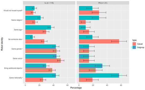 We asked the participants if they would like to see and be seen by their interlocutor when operating the robot (through an embedded camera display), or whether their anonymity and/or their partner’s anonymity should be preserved. In both scenarios, participants preferred to see and be seen by their conversation partner (Casual: IL 76.3% N = 194, PS 76.4% N = 127; Outgroup: IL 76.2% N = 160, PS 46.4% N = 28). Comparing the answers to the casual and outgroup scenarios, we observe an increase in the number of choices to maintain anonymity on both sides when meeting the outgroup (IL from 1.7% to 8.8% N = 115; PS from 4.8% to 23.8% N = 21), but only the increase of Israeli Jew participants was statistically significant (Wilcox signed rank V = 0, p = 0.006). Thus, H7 is accepted only for Israeli Jews. A high percentage of participants who preferred to try a completely new identity or to not reveal their identity via the telerobot also chose to be seen by their interlocutors via the video feed. This was the case for 76.5% of Israeli Jew participants (49/64) and 73% of Palestinian participants (54/74) in the casual scenario, and 64% of Israeli Jew participants (23/36) and 33.3% of Palestinian participants (3/9) in the outgroup scenario.