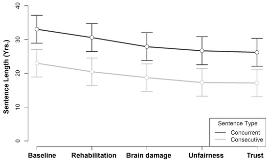 In testing the polynomial relationship between sentence length and sentence type for concurrent sentences, we found a significant negative linear effect (estimate = −5.55 yrs., p < 0.001) and positive quadratic effect (estimate = 1.45 yrs., p = 0.002) (See Table 1). This pattern was replicated in consecutive sentences. As seen in Figure 1, this pattern of significance indicates a leveling-off relationship with additional sentence-reduction contexts. Across conditions, the average baseline sentence (M = 28.0 yrs., 95% CI [25.1, 30.9]) was associated with longer sentences than Rehabilitation (M = 25.5 yrs., 95% CI [22.6, 28.4], z = 5.46, p < 0.001), Brain damage (M =23.3 yrs., 95% CI [20.4, 26.2], z = 10.35, p < 0.001), Unfairness (M = 22.0 yrs., 95% CI [19.1, 24.9], z = 13.23, p < 0.001), and Trust (M = 21.7 yrs., 95% CI [18.8, 24.6], z = 13.97, p < 0.001).