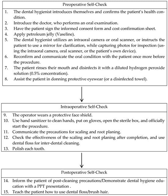 In the domain of dental care, the patient-centered standardized prophylaxis processes have been meticulously designed to enhance patient engagement and satisfaction. These processes are underpinned by a collaborative approach that involves the patient, dental hygienist, dentist, and nurse in a comprehensive communication strategy aimed at improving the overall dental experience and outcomes. The dental practitioner would instruct and communicate with the patient in every step below. The check list is in