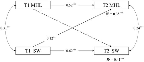 Cross-lagged model. Note. ** p < 0.01, *** p < 0.001. MHL = mental health literacy. SW = social well-being. Nonsignificant paths are represented by dotted lines. The paths from the covariates gender, single children, and SES are not presented for reasons of clarity. All path coefficients are standardized.