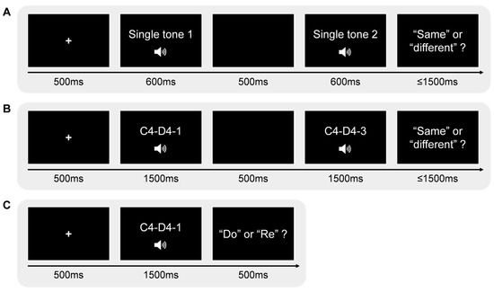 Experimental procedure. (A) Discrimination task in Experiment 1. Participants were instructed to discriminate whether two consecutive presented stimuli were the same or different. (B) Discrimination task in Experiment 2. Participants discriminated whether two consecutive presented stimuli from a musical tone continuum were the same or different. (C) Identification task in Experiment 2. Participants identified the solfege names of the presented stimuli of a musical tone continuum.