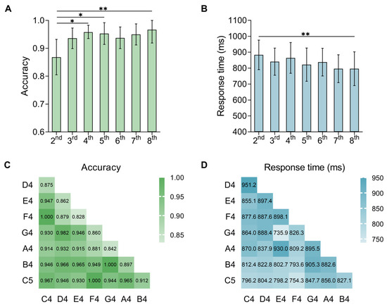 The average accuracy and response time of different-tone pairs with different pitch distances are shown in Figure 2A,B and Table 2. The results revealed a significant main effect related to the accuracy (F(6, 174) =3.000, p = 0.028, = 0.320) and the response time (F(6, 174) = 3.231, p = 0.015, = 0.462) of pitch distance. Regarding the accuracy, the post hoc test with the FDR correction method showed that the different-tone pair with 2nd pitch distance was significantly lower than that with 4th (p = 0.019), 5th (p = 0.039), and 8th (p = 0.007) pitch distance. The accuracy of the different-tone pair with 2nd was marginally significantly lower than that of the different-tone pair with 7th (p = 0.059). There was no significant difference between the other pitch distances (p > 0.1). Regarding the response time, the post hoc test with the FDR correction method showed that the pitch distance of 2nd was significantly higher than that of the 8th (p = 0.007) and marginally higher than that of the 7th (p = 0.059). The other pitch distances showed no significant difference between each other (ps > 0.1).