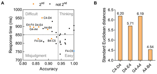 As revealed by the ANOVA, correlation, and regression analyses on pitch distance, the different-tone pairs at the 2nd pitch distance were the most difficult pairs to discriminate. However, these tone pairs consisted of minor 2nd and major 2nd pairs. We then conducted exploratory analyses on these pairs’ data. The accuracy and response times for each specific different-tone pair at this distance are shown in Figure 2C,D. We map each different-tone pair at the 2nd distance and other distance into a two-dimensional space, with the horizontal axis representing the accuracy rate and the vertical axis representing the response time. Median is a common way to differentiate individuals’ performances. If participants perform longer reaction times and lower accuracy than the median on a certain pair, the pair is difficult to discriminate. However, if participants perform shorter reaction times and higher accuracy than the median on a certain pair, the pair is easy to discriminate. Based on the logic, with the intersection of the median of the accuracy (93.862%) and the response time (850.265 ms) as the origin, the entire two-dimensional space is divided into four quadrants (Figure 3A).