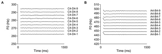 The fundamental frequency (F0) for the pitch features of each stimulus in the C4–D4 (A) and A4–B4 (B) continua.