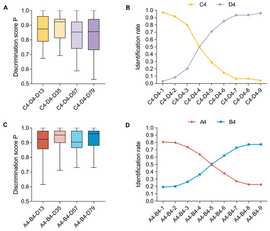 The results of the discrimination and identification task in Experiment 2. (A) Discrimination score P of C4–D4 tone continuum. (B) Identification rate of C4–D4 tone continuum. (C) Discrimination score P of A4–B4 tone continuum. (D) Identification rate of A4–B4 tone continuum.