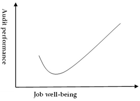 A prior study employed affective events theory to investigate the effects of employee emotions on job performance (Ashkanasy & Daus, 2002), and found that the initial emotional reactions induced by job characteristics or requirements usually do not persist for a long time, and employees’ job performance varies due to fluctuating emotions. However, with positive characteristics and requirements continuing to exist and exert their influences in the workplace, employees’ emotions will develop into stable positive affect, which can, in turn, bring unexpected job performances. Auditors’ job is characterized by a high workload and responsibility. They are required to comply with standards on accounting and auditing, and complete assigned tasks within the specified time, so they are performing a highly professional job. Based on the view of Ashkanasy and Daus, this study argues that when auditors are influenced by positive events at work to show more positive emotions and fewer negative ones, their job well-being will grow. Because their emotions are still in an unstable state, their job well-being is usually not high, which would further affect their job performance. As a result, they will usually deliver a normal or even lower level of audit performance. However, with positive events at work continuing to emerge in the workplace, their job well-being will drastically increase. In the meantime, their pleasant emotions will induce a rapid growth of audit performance. To sum up, on the spectrum of job well-being from low to high, audit performance will slightly decrease first and then drastically increase later. As shown in Figure 1, the job well-being and audit performance are in a curvilinear relationship instead of a simple linear relationship. Therefore, the first hypothesis is proposed as follows: