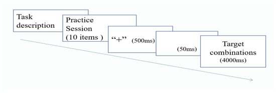 The procedure for each block of trials was as follows: a red fixation point “+” appeared at the center of the computer screen for 500 milliseconds (hereafter, ms) to alert the participants, followed by a blank screen for 50 ms. When the target item appeared on the screen, the participants were required to make a judgment within 4000 ms before the next trial began. The participants needed to quickly assess whether the test item represented a correct English collocation and respond using the keyboard. If they considered the target item a valid English collocation, they pressed the “J” key with the right hand; otherwise, they pressed the “F” key with the left hand. The item disappeared automatically if no response was made within 4000 ms. To prevent the fatigue effect, the participants took a self-defined time break after every 60 items. The participants completed the task independently in a quiet computer lab, taking approximately 8 min to finish it. The task procedure is visualized in Figure 1.
