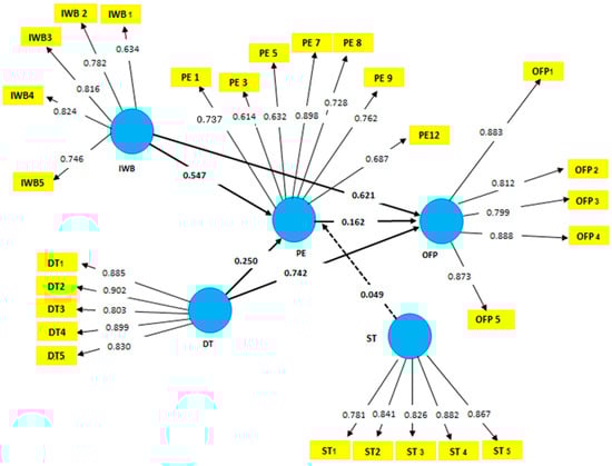 The measurement items for the variables are used from previous studies, and all the variables are measured on a Likert scale of 1–5, where 1 indicates strongly agree and 5 means strongly disagree. Further, after the analysis, Table 2 elaborates on Cronbach’s alpha (CA) values. These values met the threshold level given by Hair et al., 2022 of 0.7–0.9. Specifically, OFP has a CA of 0.896, DT has a CA of 0.892, ST has a CA of 0.945, and IWB has a CA of 0.934. The composite reliability (CR) values for each construct are as follows: DT (0.894), IWB (0.948), ST (0.953), PE (0.946), and OFP (0.923). The average variance extracted (AVE) values exceed the threshold level of 0.5: DT (0.751), IWB (0.583), ST (0.706), PE (0.693), and OFP (0.951).