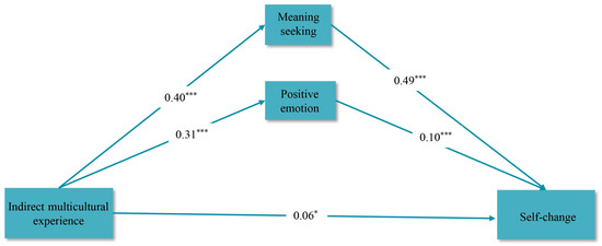 Model 4 of the SPSS 26.0 macro PROCESS v3.5 (Hayes, 2018) was used to test the mediating role of positive emotions and meaning seeking between indirect multicultural experiences and self-change. The results are shown in Table 3. Step 1 indicated that indirect multicultural experiences significantly positively predicted positive emotions (β = 0.31, t = 12.26, 95% CI = [0.26, 0.36], p < 0.001). Step 2 showed that indirect multicultural experiences positively predicted meaning seeking (β = 0.40, t = 15.6, 95% CI = [0.35, 0.45], p < 0.001). Step 3 showed that indirect multicultural experiences significantly positively predicted self-change (β = 0.06, t = 2.45, 95% CI = [0.01, 0.11], p = 0.01). Moreover, positive emotions and meaning seeking also significantly positively predicted self-change (β = 0.10, t = 4.01, 95% CI = [0.05, 0.15], p < 0.001; β = 0.49, t = 19.95, 95% CI = [0.44, 0.54], p < 0.001). This suggested that positive emotions and meaning seeking simultaneously play a partial mediating role in the relationship between indirect multicultural experiences and self-change (Figure 2).