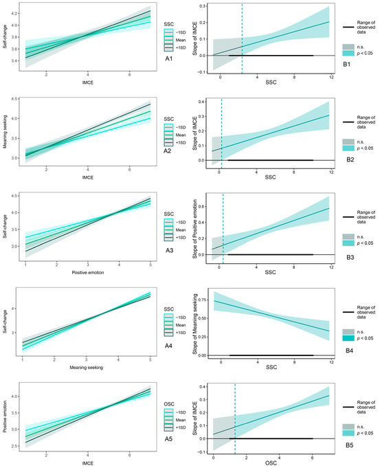 Simple slope plots of moderating effects. Panel (A) (point-estimation method): (A1) SSC moderates “IMCE—Self-change”; (A2) SSC moderates “IMCE—Meaning seeking”; (A3) SSC moderates “Positive emotion—Self-change”; (A4) SSC moderates “Meaning seeking—Self-change”; (A5) OSC moderates “IMCE—Positive emotion”. Panel (B) (J-N method): (B1) SSC moderates “IMCE—Self-change”; (B2) SSC moderates “IMCE—Meaning seeking”; (B3) SSC moderates “Positive emotion—Self-change”; (B4) SSC moderates “Meaning seeking—Self-change”; (B5) OSC moderates “IMCE—Positive emotion”.