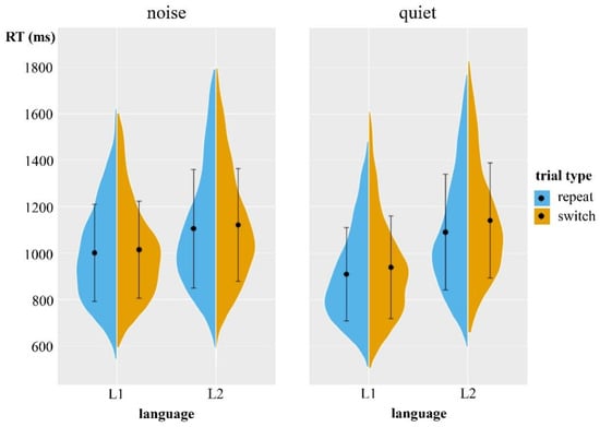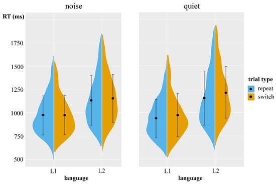 Five participants in Experiment 1 were excluded from the final data analysis because their accuracy was lower than 80%. Thus, the final sample consisted of thirty-one participants (18 females) with an average age of 19.52 years old (SD = 1.43). The response times (RTs) in the language-switching task were analyzed using frequentist analyses and Bayesian regression analyses. RTs were log-transformed as dependent variables. For frequentist analyses, the linear mixed-effects models were conducted in R using the lme4 package (). The fixed effects included condition (quiet, noise), language (L1, L2), type (repeat, switch), and their full interactions with subjects and items as random effects. All variables were sum-contrast-coded (i.e., −0.5 for quiet and 0.5 for noise; −0.5 for L1 and 0.5 for L2; −0.5 for repeat and 0.5 for switch).