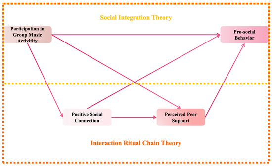 Interaction Ritual Chain Theory emphasizes that through interactive rituals, individuals form emotional energy and a sense of unity in face-to-face interactions. Perceived peer support plays an important role in group music activities in a number of ways. First, perceived peer support can enhance participants’ emotional energy. This high emotional energy comes from the recognition and encouragement of peers, and it continues to accumulate during interactions, thereby enhancing individuals’ positive emotions. Specifically, when college students feel supported and appreciated by their peers during music activities, they experience higher levels of emotional satisfaction and self-esteem, which further motivates them to actively participate and engage in the activities. Second, peer support provides positive social feedback, strengthening the individual’s status and role identity in the group. According to the theory of an interactive ritual chain, this emotional resonance is the key to the success of interaction, and through the positive feedback mechanism, it further enhances the individual’s sense of belonging and identity. In music activities, peer support and encouragement make participants feel recognized and understood, which resonates emotionally, enhances emotional energy, and at the same time strengthens emotional attachment to the group. Third, individuals who perceive peer support are more likely to follow the group’s behavioral norms and exhibit pro-social behavior. The emotional energy and sense of solidarity formed through interactive rituals are transformed into compliance with group behavioral norms and the expression of positive social behaviors. In other words, perceived peer support motivates individuals to participate more actively in group activities and to be willing to help and cooperate, in order to maintain and strengthen the group’s cohesion and positive interaction atmosphere. Fourth, peer support also further promotes the occurrence of pro-social behavior by enhancing the accumulation of social capital. The theory of an interactive ritual chain suggests that the emotional energy and sense of solidarity accumulated through interactive rituals can be transformed into social capital, which in turn promotes individuals’ pro-social behavior. In group music activities, individuals who perceive peer support are more likely to establish and maintain good social relationship networks. These relationship networks provide individuals with more resources and support, making them more willing to exhibit pro-social behavior. Therefore, perceived peer support plays an important mediating role between participation in group music activities and pro-social behavior by increasing emotional energy, enhancing emotional resonance, promoting compliance with behavioral norms, and accumulating social capital. Unlike other studies, this paper introduces perceived peer support into the research framework of music and pro-social behavior for the first time. Based on this, this paper proposes the following hypothesis: