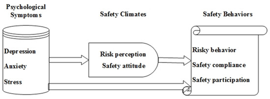 Psychological symptoms such as depression, anxiety, and stress can directly affect construction workers’ safety behaviors, including risky behavior, safety compliance, and safety participation. Depression often leads to disengagement from safety measures, resulting in increased risky behaviors and reduced safety compliance and participation. Anxiety can heighten vigilance, potentially improving safety compliance, but may also lead to risky behavior due to impaired judgment, while reducing safety participation. Stress may cause workers to prioritize speed over safety, leading to more risky behavior and decreased safety compliance and participation. Thus, the study proposes the following hypotheses: