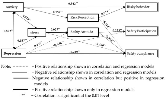 The results of the correlation analysis (refer to Table 3) indicate that depression (S1) is significantly correlated with the other two psychological symptoms (i.e., anxiety (S2: 0.572) and stress (S3: 0.557)), two components of safety climate (i.e., risk perception (F1: 0.369) and safety attitude (F2: −0.236)), and two types of safety behaviors (i.e., safety compliance (SB2: −0.249) and safety participation (SB3: −0.246)). Anxiety (S2) is significantly correlated with risk perception (F1: 0.559), risky behavior (SB1: 0.342), safety compliance (SB2: −0.340), and stress (S3: 0.525). Stress (S3) is significantly correlated with risk perception (F1: 0.342) and safety compliance (SB2: −0.460). In terms of safety climate, risk perception (F1) is significantly correlated with two safety behaviors: risky behavior (SB1: 0.374) and safety compliance (SB2: −0.342); safety attitude (F2) is significantly correlated with safety compliance (SB2: 0.326) and safety participation (SB3: 0.233).