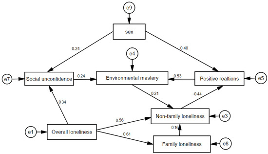 We found no sex differences in loneliness variables but significant differences in social unconfidence, environmental mastery, and positive relations with others, so sex was also included in the path model since it could affect our background variables.