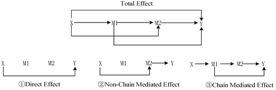 In the equation, represents the direct effect of . is the non-chain-mediated effect of , which means the indirect effect of the treatment variable on the outcome variable via mediator .represents the chain-mediated effect of (including the paths and . Figure 2 illustrates the theoretically possible causal paths from the treatment variable to the outcome variable : (1) ; (2) ; (3) .
