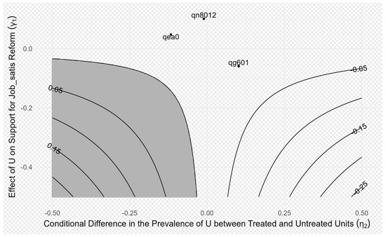 In Figure 3, different values of γ1 and η1 form contour lines representing the bias-adjusted PSE. The figure also shows the possible values of γ1 and η1 when U has the same effect as three observed covariates (e.g., marital status, social status, and frequency of night shifts). It is evident that only when both γ1 and η1 are relatively large (e.g., when both γ1 and η1 are −0.25) could the original estimated value (−0.017) be entirely attributed to this unobserved confounding. In other words, unless γ1 and η1 both reach considerably large values, the unobserved variable U is unlikely to fully explain the originally estimated effect, indicating that the original research findings are robust to potential unobserved confounding. Additionally, judgment can be made based on whether the sensitivity analysis points fall within the gray area. If the annotation points in the sensitivity analysis (representing the hypothesized influence of specific unobserved variable U) do not fall within the gray area, this suggests that even if such unobserved confounding factors exist, they are unlikely to alter the direction of the research conclusions, thus indicating that the original research findings are relatively robust. In conclusion, the results suggest that these estimates would only be significantly affected under extreme circumstances (i.e., when the influence of the unobserved variable U is very large and significantly differs between treatment and non-treatment groups). This provides support for the credibility of the research findings.