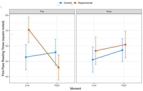 To examine the effect of RT on text processing patterns, we conducted a linear mixed model analysis evaluating the effects of group (control vs. experimental), moment (pre vs. post), and syntactic complexity (low vs. high) on FPRTs. The main effect of group was significant, with the experimental group showing higher FPRTs compared to the control group (β = 17.80, SE = 5.38, t = 3.31, CI = [7.19, 28.42]); however, the main effects of moment (β = −1.70, SE = 5.12, t = −0.33, CI = [−11.79, 8.38]) and syntactic complexity (β = 3.12, SE = 5.53, t = 0.56, CI = [−7.79, 14.02]) were not significant. Interaction effects provided further insights into the relationships between factors. The interaction between group and syntactic complexity was significant (β = −27.68, SE = 7.12, t = −3.89, CI = [−41.72, −13.64]), suggesting that the experimental group exhibited reduced FPRTs under high syntactic complexity compared to the control group. Additionally, the three-way interaction among group, moment, and syntactic complexity was significant (β = 25.52, SE = 10.25, t = 2.49, CI = [5.31, 45.73]), highlighting a nuanced relationship among these factors (see Figure 2 and Table A1).