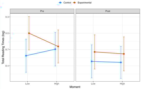 We conducted a second linear mixed model analysis to assess the effects of group (control vs. experimental), moment (pre vs. post), and syntactic complexity (low vs. high) on TRTs. The main effect of the group was significant, with the experimental group showing longer TRTs compared to the control group (β = 0.41, SE = 0.13, t = 3.14, CI = [0.15, 0.67]). In contrast, the main effects of moment (β = −0.10, SE = 0.12, t = −0.86, CI = [−0.34, 0.13]) and syntactic complexity (β = 0.12, SE = 0.19, t = 0.62, CI = [−0.26, 0.50]) were not significant. Interaction effects provided additional insights into how these factors interacted. A significant group in terms of syntactic complexity interaction (β = −0.36, SE = 0.16, t = −2.26, CI = [−0.68, −0.05]) suggested that participants in the experimental group demonstrated reduced TRTs under conditions of high syntactic complexity compared to the control group; however, the three-way interaction among group, moment, and syntactic complexity was not significant (β = 0.35, SE = 0.23, t = 1.49, CI = [−0.11, 0.81]), indicating no additional complexity in the relationship among these factors (see Figure 3 and Table A3).