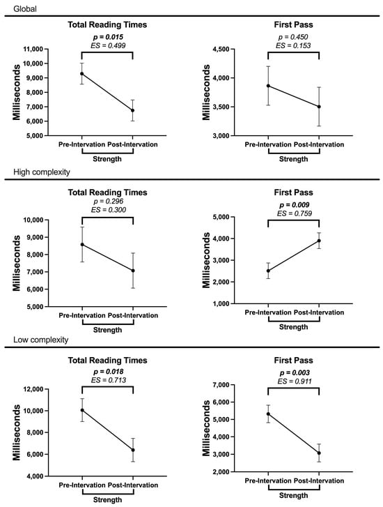 Given our aim to investigate the effect of strength training on participants’ cognitive performance, we conducted additional analyses in the experimental group. Specifically, ANOVAs were conducted according to the average strength levels of the pre–post-intervention maximal tests (mean pre = 31.5 ± 9.50; mean post = 42.7 ± 11.1). Figure 4 shows the comparison of the eye-tracker measurements obtained with the pre–post-intervention strength levels globally and separated by syntactic complexity. Overall, in TRTs and FPRTs we found significant differences attributed to the increase in strength after the intervention. In particular, there were significant differences in favor of increased strength in overall reading times and at low syntactic complexity. Similarly, in FPRTs we found significant differences in high and low syntactic complexity.