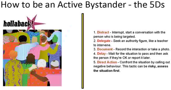 - Storer, H. L., Casey, A. E., & Herrenkohl, T. I. (2017). Developing “whole school” bystander interventions: The role of school-settings in influencing adolescents responses to dating violence and bullying. Children and Youth Services Review, 74, 87–95. [Google Scholar] [CrossRef]