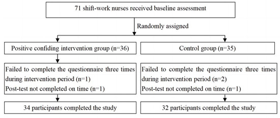 In total, 71 shift work nurses enrolled in the study. During the intervention period, two participants withdrew from the experimental group, and three withdrew from the control group. Sixty-six participants in total completed the entire study. The recruitment flow chart is demonstrated in Figure 1.