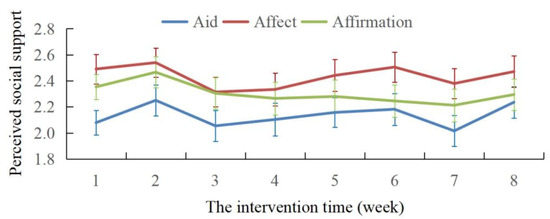 In the intervention group, the three aspects of social support include aid, affect, and affirmation (see Figure 2). The results of repeated ANOVA for 3 (aspects of social support) × 8 (weeks) showed that the interaction effect between time and social support was not significant, with F (1, 14) = 0.579, p = 0.879. The main effect of social support was not significant, F (1, 2) = 1.599, p = 0.207, while the main effect of time was significant, F (1, 7) = 3.056, p = 0.006. The results of the post hoc tests showed that there was no difference between social support in the first week and any other week, both the social support in the second week and the eighth week were higher than the third, the fourth, and the seventh week, and the social support of the sixth week was higher than the seventh week (all p < 0.05). Meanwhile, the score for “affect” was always the highest while the score for “aid” was always the lowest, and the results indicate that the difference between “affect” and “aid” was significant, t = 9.663, p < 0.001.