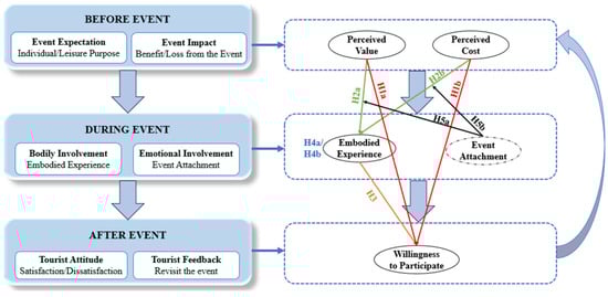 As shown in Figure 1, the conceptual framework was constructed based on the above discussions. To further explain Figure 1, the left side represents the whole process that tourists experience in the event. Before the event starts, tourists have expectations based on their previous resource collection and event experience. They might feel both benefits and losses from the event as they evaluate the cost and value of the event. During the event, bodily and emotional factors will emerge to affect their behaviour. After the event, tourists will form an attitude towards the event, they will feel satisfied or not, and decide whether they will be willing to participate in the event or not. On the right side of Figure 1, different phases of the event process have certain factors to form. The model demonstrates the relationship and mechanism among tourists’ perception, behaviours, and attitude, including perceived value, perceived cost, willingness to participate, embodied experience, and event attachment, and these factors represent the measurable variables for phases corresponding with the left side.