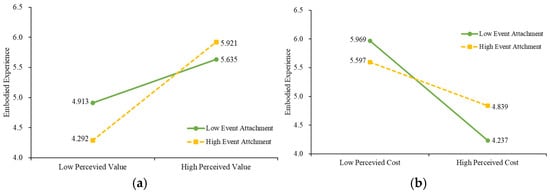 Figure 2. Moderated effect of event attachment. (a) Moderating role of event attachment in the relationship between perceived value and embodied experience. (b) Moderating role of event attachment in the relationship between perceived cost and embodied experience.