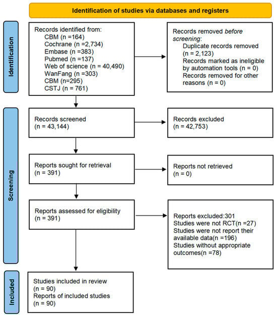 A total of 46,871 articles were identified following an initial database search. Subsequently, 2123 records were removed due to duplication, and an additional 34,760 records were discarded based on an evaluation of their titles and abstracts. Out of the remaining 391 articles, 10 were sourced through manual searches. After a thorough examination of the complete texts, 301 records were eliminated for various reasons: 27 studies were not RCTs, 78 studies did not yield suitable results, and 196 studies failed to disclose their accessible data. Ultimately, 90 studies were included for NMA.