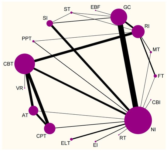 Network meta-analysis of eligible comparisons. AT, Electroacupuncture Therapy; CBT, Cognitive Behavior Therapy; CBI, Craving Behavior Intervention; CPT, Compound Psychotherapy; EBF, Electroencephalogram Biological Feedback; ELT, Electrotherapy; EI, Educational Intervention; FT, Family Therapy; GC, Group Counseling; MT, Mindfulness Therapy; NI, No Intervention; RI, Routine Intervention; RT, Reality Therapy; PPT, Positive Psychology Therapy; ST, Sandplay Therapy; SI, Sports Intervention; VRT, Virtual Reality Therapy.