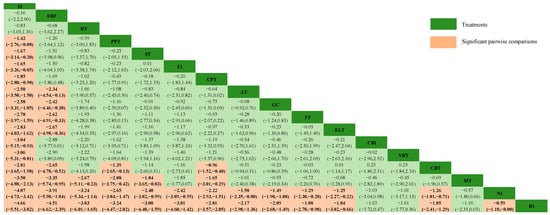 Figure 3 displays the post-intervention efficacies of different NPI approaches (bold and red represent statistical significance). Twelve intervention approaches were found to be statistically superior to routine intervention (RI), and these included SI (SMD = −4.66, CrI: −5.51, −3.82), EBF (SMD = −4.51, CrI: −6.62, −2.39), RT (SMD = −3.83, CrI: −6.01, −1.65), ST (SMD = −3.00, CrI: −4.40, −1.59), EI (SMD = −3.01, CrI: −4.60, −1.42), CPT (SMD = −2.81, CrI: −3.57, −2.05), AT (SMD = −2.17, CrI: −2.98, −1.36), GC (SMD = −2.09, CrI: −2.68, −1.49), FT (SMD = −1.88, CrI: −2.78, −0.98), ELT (SMD = −1.84, CrI: −3.02, −0.66), CBT (SMD = −1.85, CrI: −2.41, −1.29), NI (SMD = −0.59, and CrI: −1.18, −0.00). However, only SI showed significantly more benefits than CBI [(SMD = −3.04, CrI: −5.15, −0.93) and VRT (SMD = −3.06, CrI: −5.31, −0.81)].