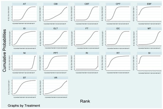 Surface under cumulative ranking curve, ranking non-pharmacological intervention effects for youths with internet addiction. AT, Electroacupuncture Therapy; CBT, Cognitive Behavior Therapy; CBI, Craving Behavior Intervention; CPT, Compound Psychotherapy; EBF, Electroencephalogram Biological Feedback; ELT, Electrotherapy; EI, Educational Intervention; FT, Family Therapy; GC, Group Counseling; MT, Mindfulness Therapy; NI, No Intervention; RI, Routine Intervention; RT, Reality Therapy; PPT, Positive Psychology Therapy; ST, Sandplay Therapy; SI, Sports Intervention; VRT, Virtual Reality Therapy.