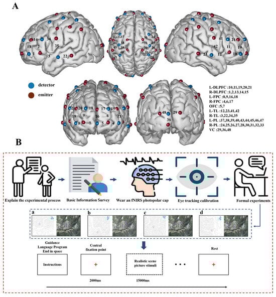 Hemodynamic responses in the cerebral cortex during task performance were monitored using the NirSmart-6000A (Huichuang, Danyang, China) functional near-infrared spectroscopy system. Optodes were positioned according to the 10–20 international system, covering the bilateral prefrontal cortices, temporal lobes, frontoparietal sensorimotor areas, and occipital lobe. The probe configuration comprised 24 sources + 16 detectors, forming 48 measurement channels with a sampling frequency of 11 Hz. Probe holders were secured via an elastic head cap, with hair parted to ensure optode-scalp contact. Ten regions of interest (ROIs) were defined using the LPBA40 (LONI Probabilistic Brain Atlas) anatomical atlas. See Figure 1A.