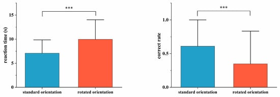 Paired-samples t-tests revealed significantly higher accuracy under normal map orientation compared to rotated orientation [t = 8.612, p < 0.001, Cohen’s d = 0.248], alongside significantly shorter reaction times [t = −11.069, p < 0.001, Cohen’s d = 2.131]. See Figure 2.