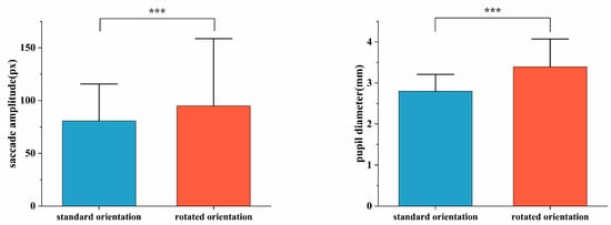 Differences in saccade amplitude and pupil diameter during terrain symbol representation tasks across map orientations. Note: *** p < 0.001.